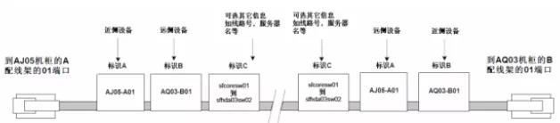例如,連接到圖4.7.4-3所示配線架第一個(gè)位置的線纜可能包含如下標(biāo)簽:AJ05-A01/AQ03-B01。 AQ03 機(jī)柜中的同一根電纜將包含以下標(biāo)簽:AQ03-B01/AJ05-A01。如圖6 如圖。